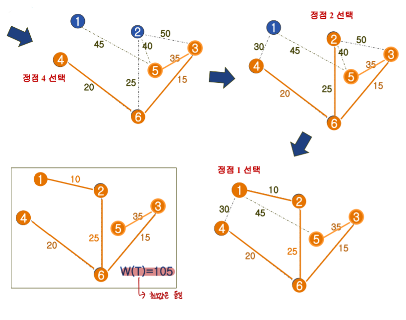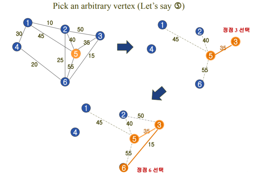 임의의 정점(vertex)에서 가중치가 가장 작은 간선(edge)을 선택,