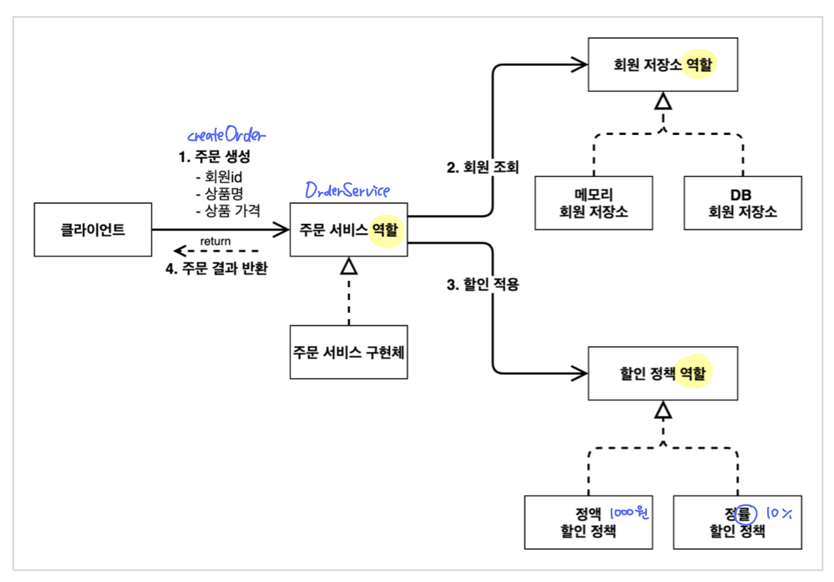 주문 생성 요청이 오면, 회원 정보를 조회하고, 할인 정책을 적용한 다음 주문 객체를 생성해서 반환한다.