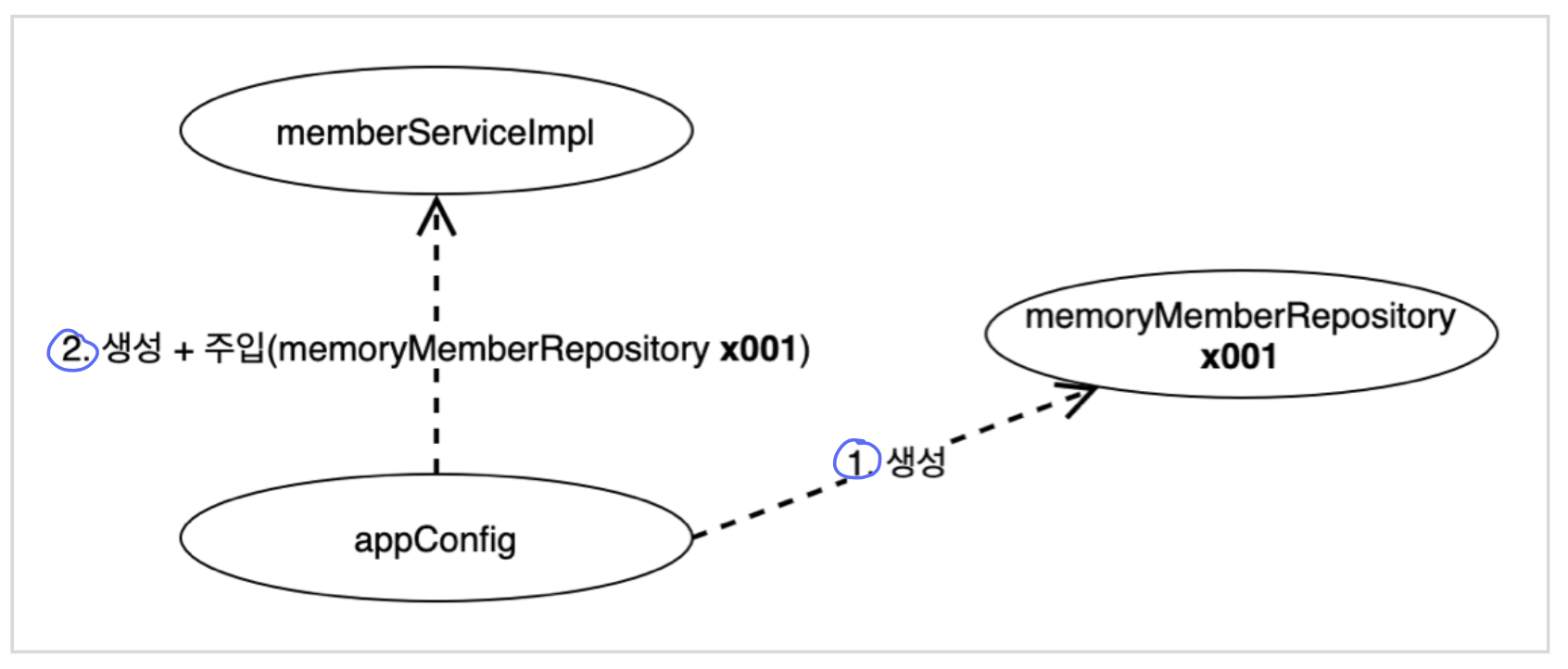 - AppConfig 객체는 memoryMemberRepository 객체를 생성하고 그 참조값(x001)을 memberServiceImpl을 생성하면서 생성자로 전달한다.