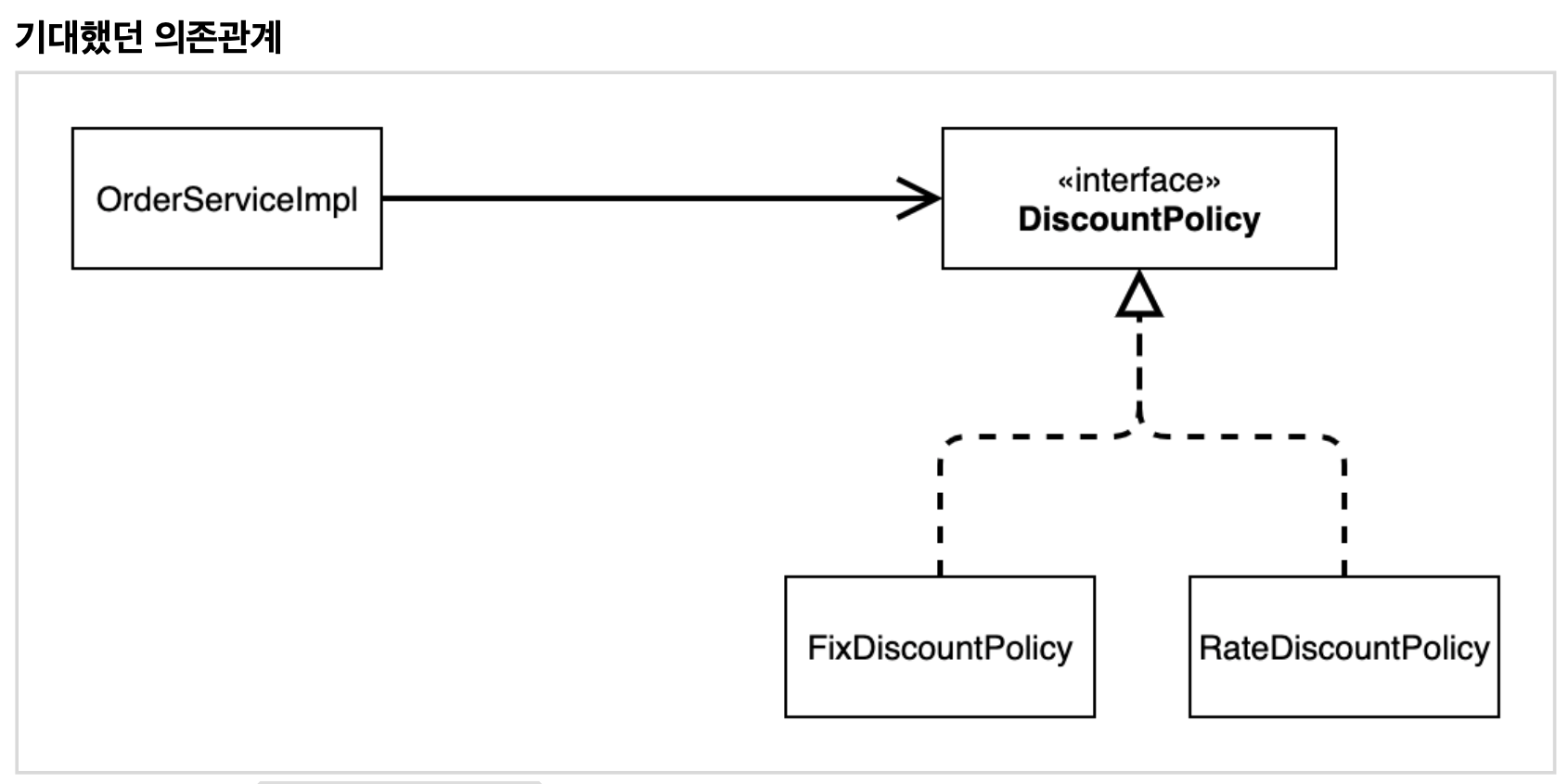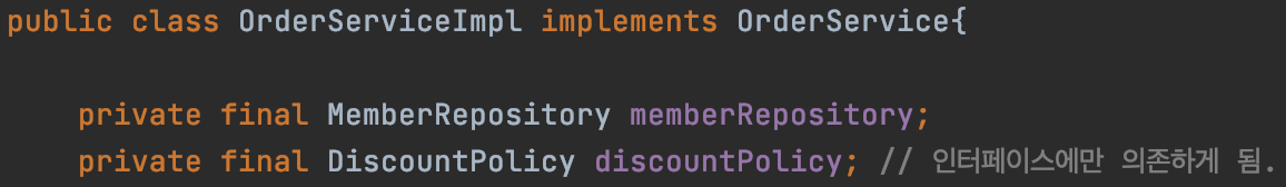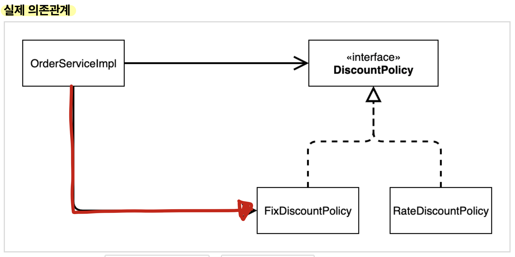 - 예) OrderServiceImpl은 인터페이스 DiscountPolicy에 의존하지만, 구현체인 FixDiscountPolicy, RateDiscountPolicy에도 의존한다. (아래에서 자세히 설명)