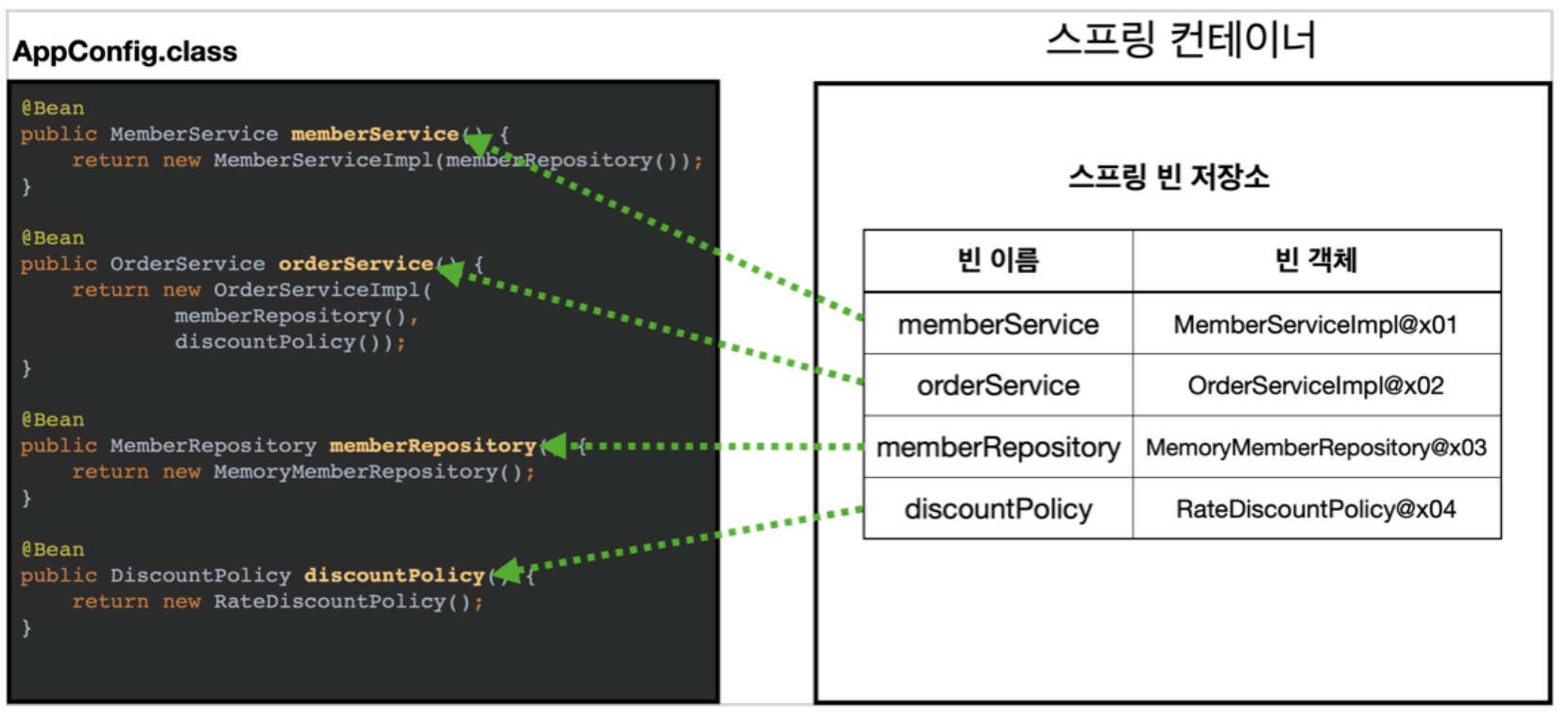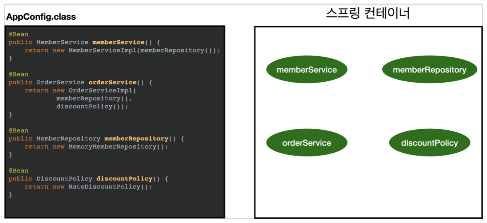 - 여기서 @Bean이라 적힌 메서드를 모두 호출해서 반환된 객체를 스프링 컨테이너에 등록한다. 이렇게 스프링 컨테이너에 등록된 객체를 스프링 빈이라 한다.
