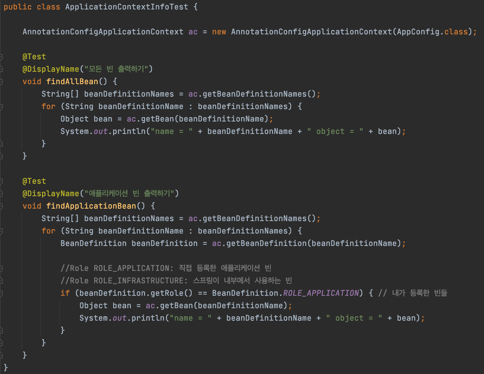 - ac.getBean() : 빈 이름으로 빈 객체(인스턴스)를 조회한다. 애플리케이션 빈 출력하기