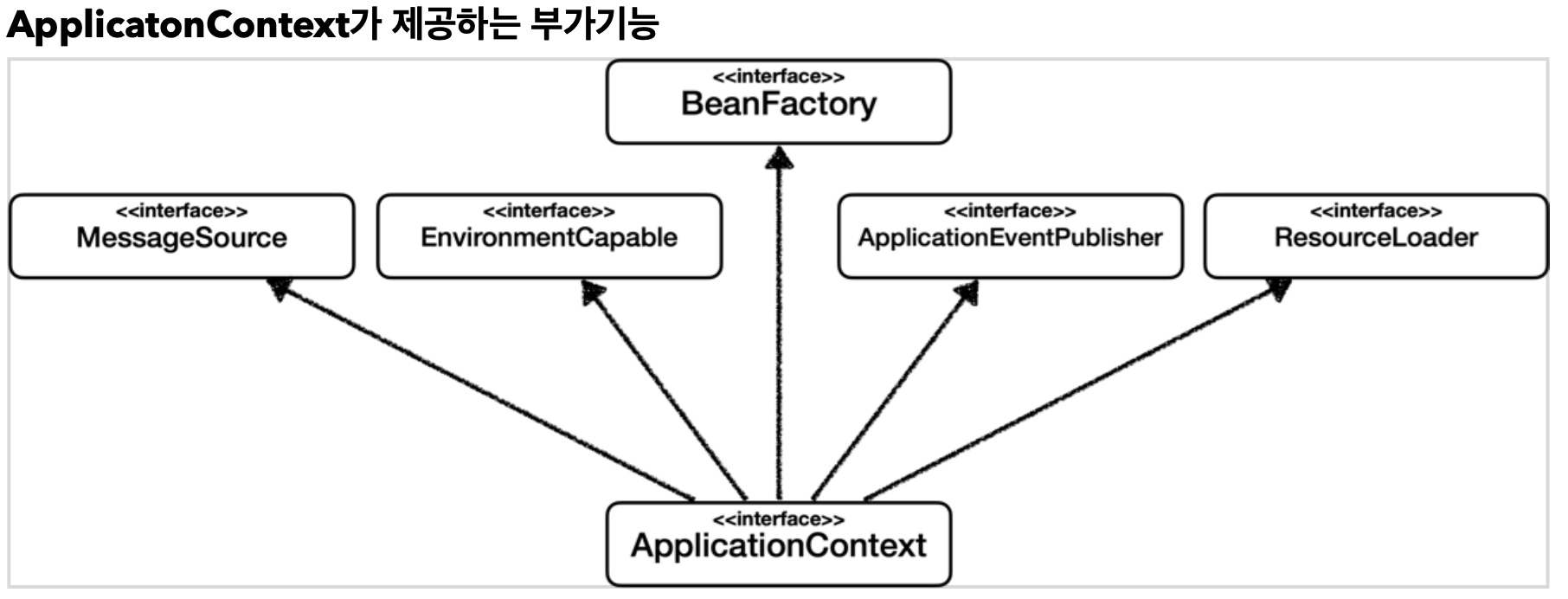 - ApplicationContext는 빈을 관리하고 조회하는 기능은 물론, 수 많은 부가기능이 존재 (많은 인터페이스 상속 받음)