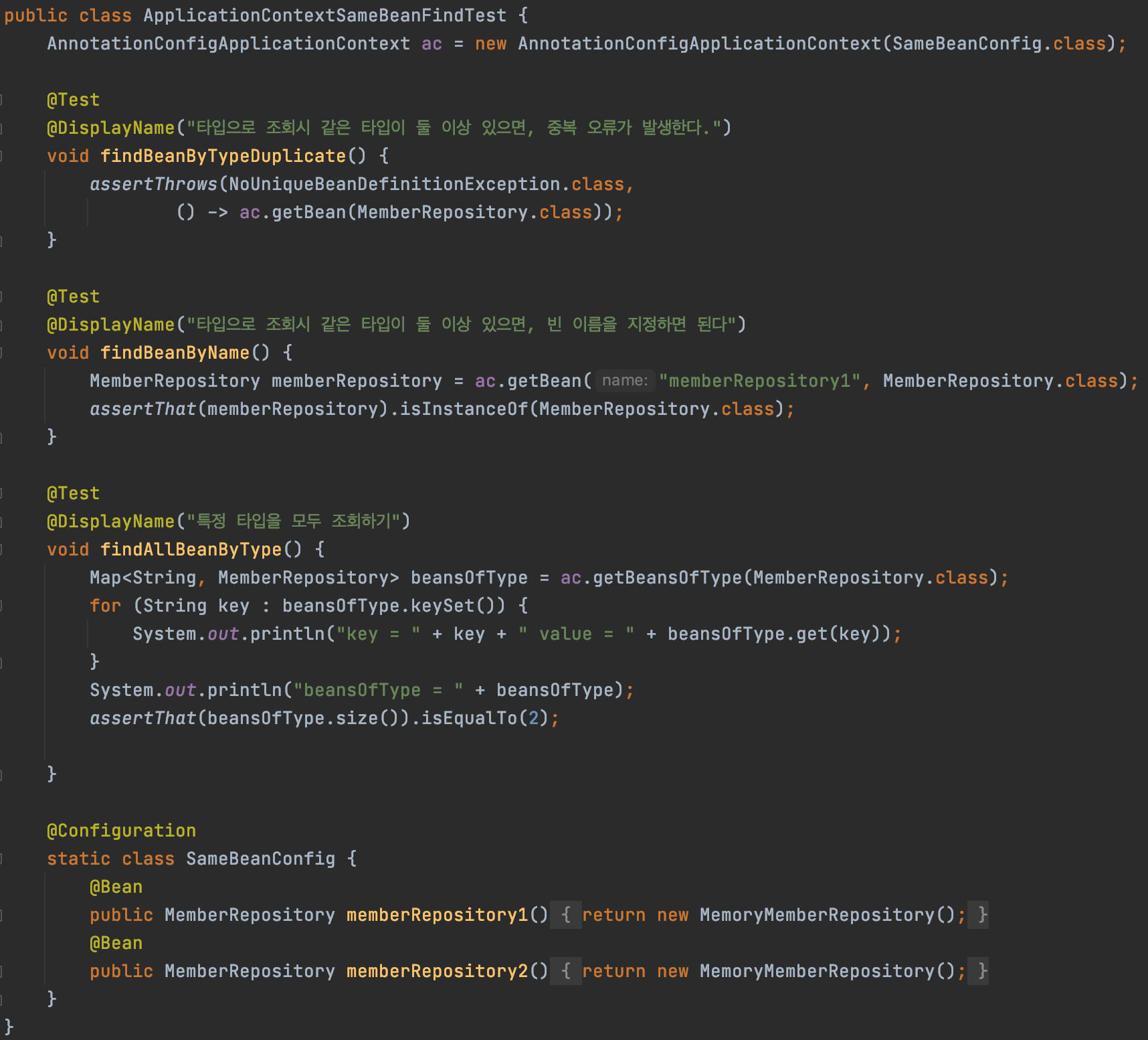 - ac.getBeansOfType() 을 사용하면 해당 타입의 모든 빈을 조회할 수 있다. (Type으로 조회)