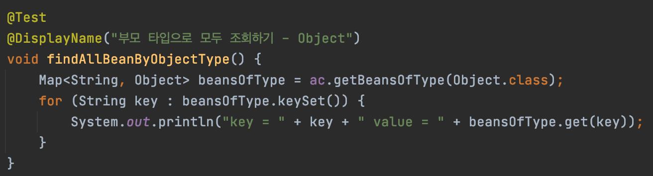 - 그래서 모든 자바 객체의 최고 부모인 Object 타입으로 조회하면, 모든 스프링 빈을 조회한다.
