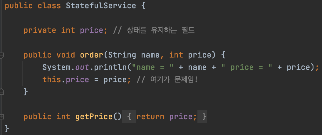공유 필드는 정말정말 조심해야 한다!!! 스프링 빈은 항상! 언제나! 무상태(Stateless)로 설계하자.
