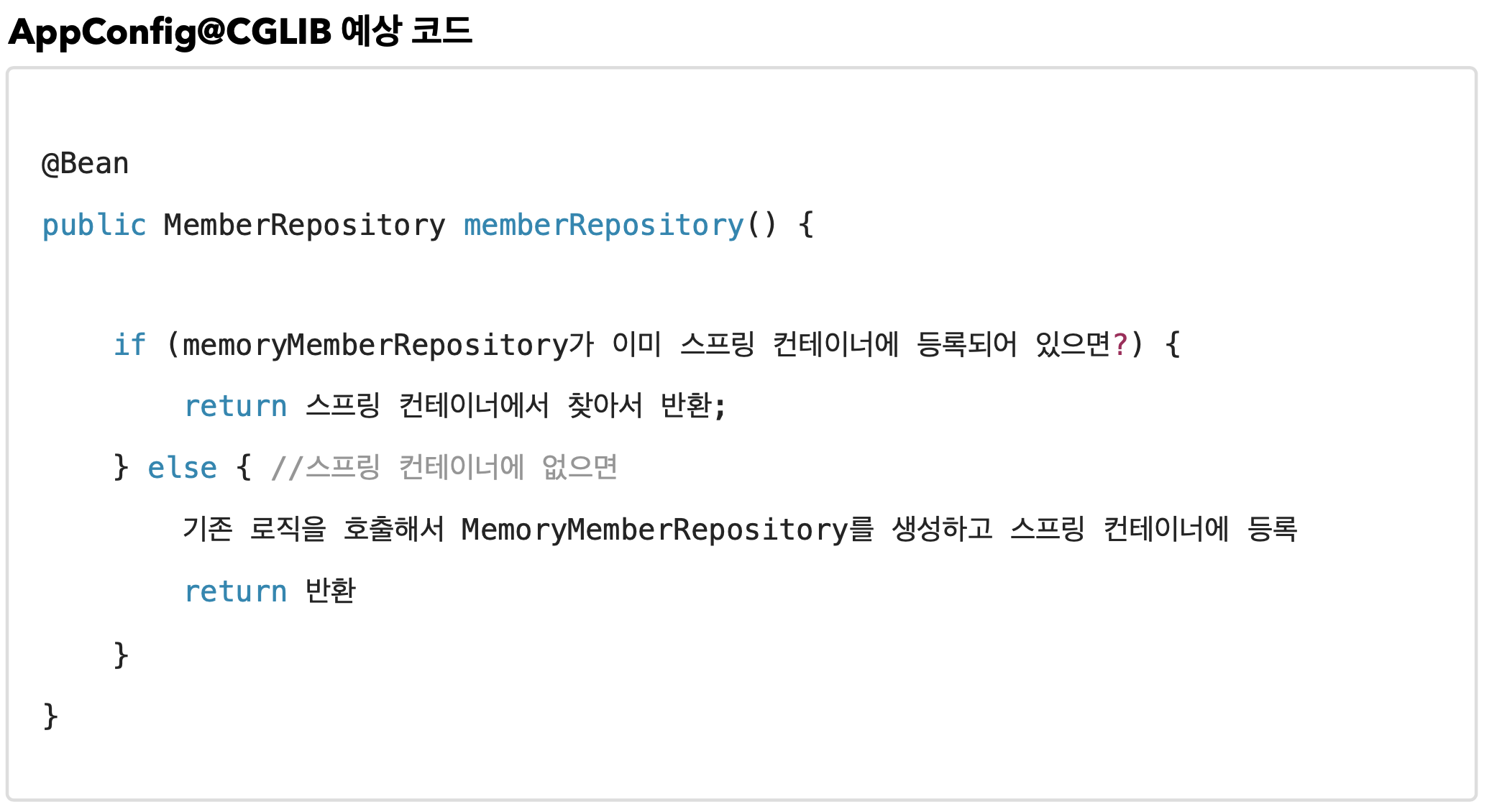@Bean이 붙은 메서드마다 이미 스프링 빈이 존재하면 존재하는 빈을 반환하고, 스프링 빈이 없으면 생성 해서 스프링 빈으로 등록하고 반환하는 코드가 동적으로 만들어진다.