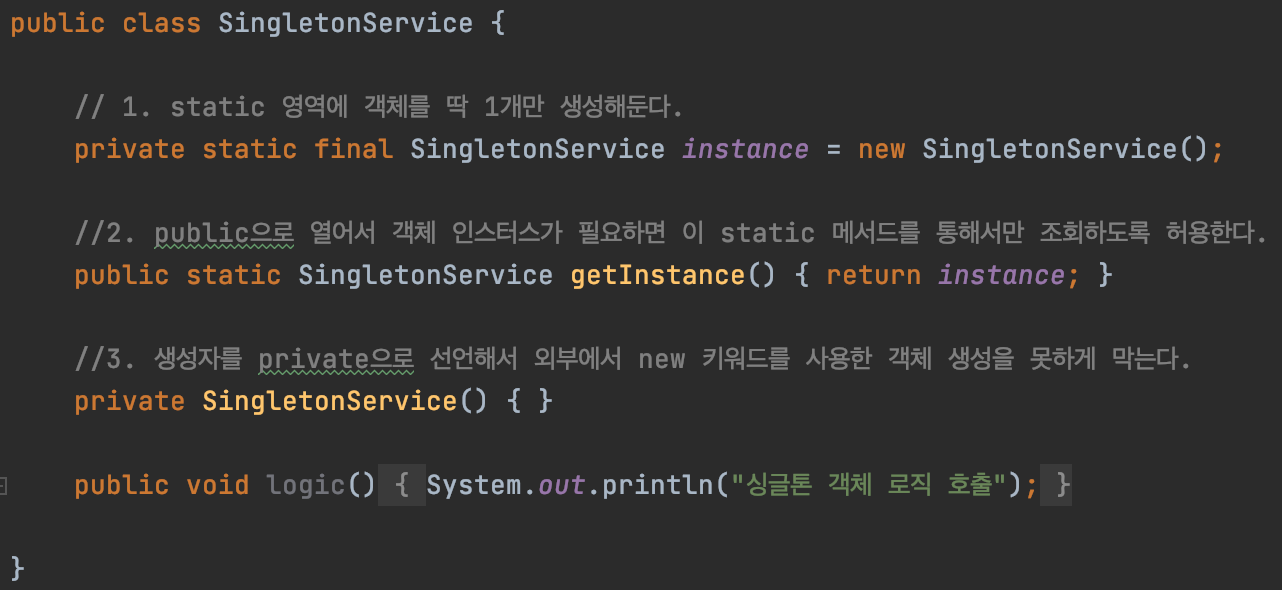 객체 인스턴스를 2개 이상 생성하지 못하도록 private 생성자를 사용해서 외부에서 임의로 new 키워드를 사용하지 못하도록 한다.