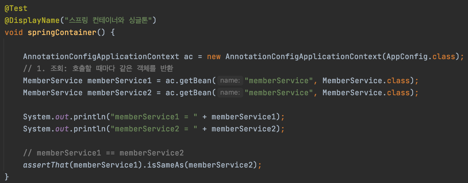 스프링 컨테이너는 싱글톤 컨테이너 역할을 한다. 이렇게 싱글톤 객체를 생성하고 관리하는 기능을 싱글톤 레지스트리라 한다.