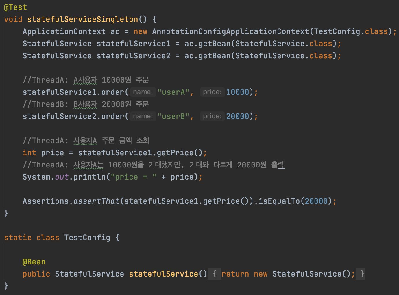 공유 필드는 정말정말 조심해야 한다!!! 스프링 빈은 항상! 언제나! 무상태(Stateless)로 설계하자.