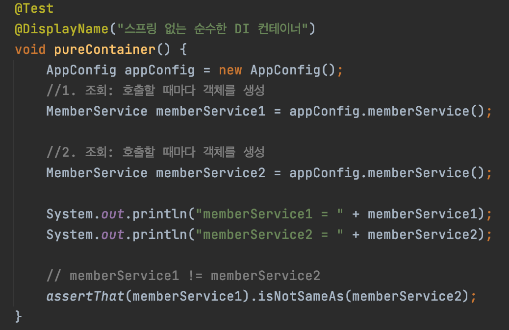스프링 없는 순수한 DI 컨테이너인 AppConfig는 요청을 할 때 마다 객체를 새로 생성한다.