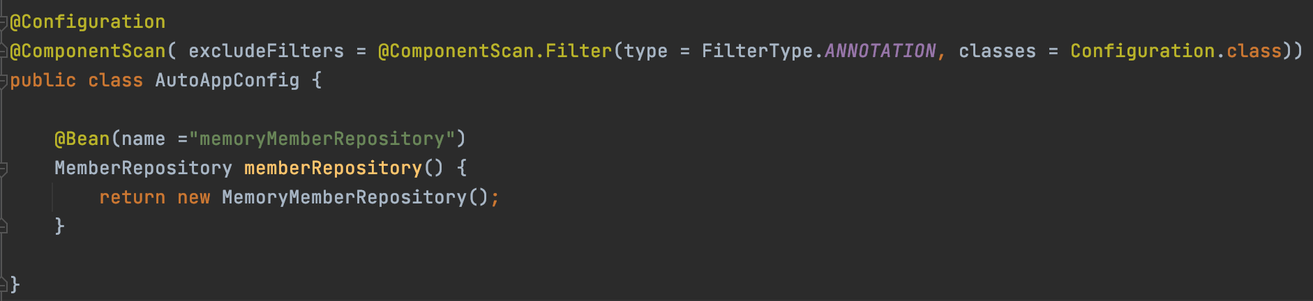 컴포넌트 스캔에 의해 자동으로 스프링 빈이 등록되는데, 그 이름이 같은 경우 스프링은 오류를 발생시킨다.