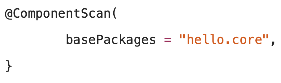 - 만약 지정하지 않으면 @ComponentScan 이 붙은 설정 정보 클래스의 패키지가 시작 위치가 된다. → 성능 저하
