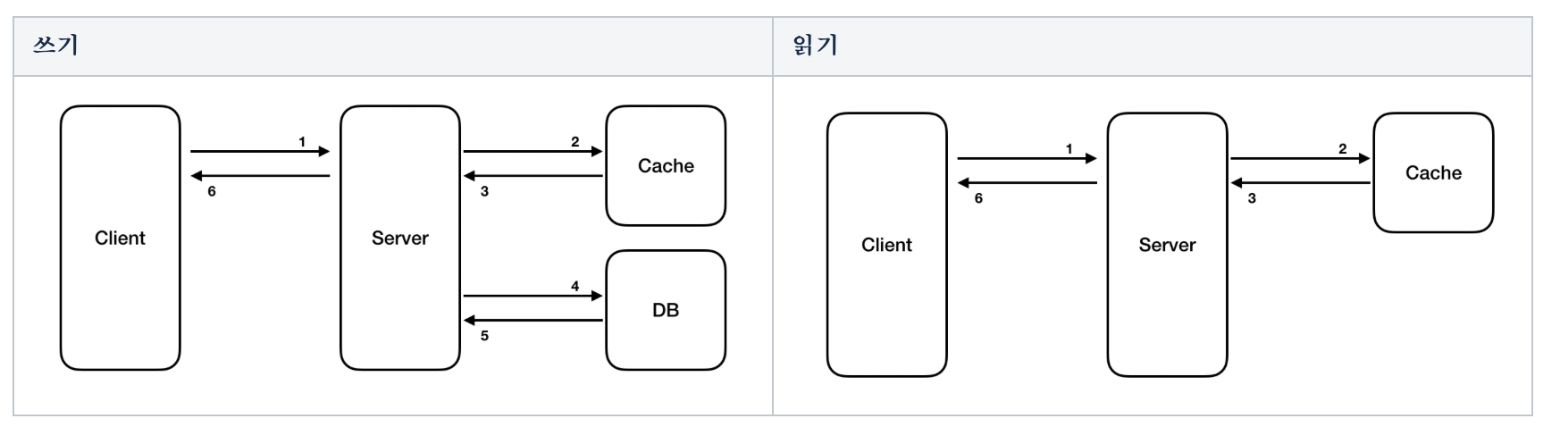 - 데이터를 추가하거나 수정할 때, Cache와 DB 모두 동시에 업데이트 된다.