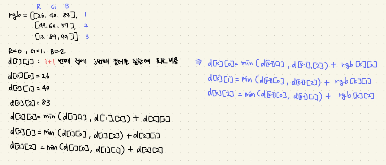 i+1번째 집은 i번째 집에 칠한 컬러를 제외한 나머지 색을 칠했을 때의 최소 비용을 생각하며 점화식을 세운다.