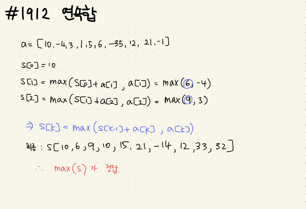 s[k] : max(s[k-1] + k 번째 값 vs 처음부터 다시 시작하기 (a[k]))